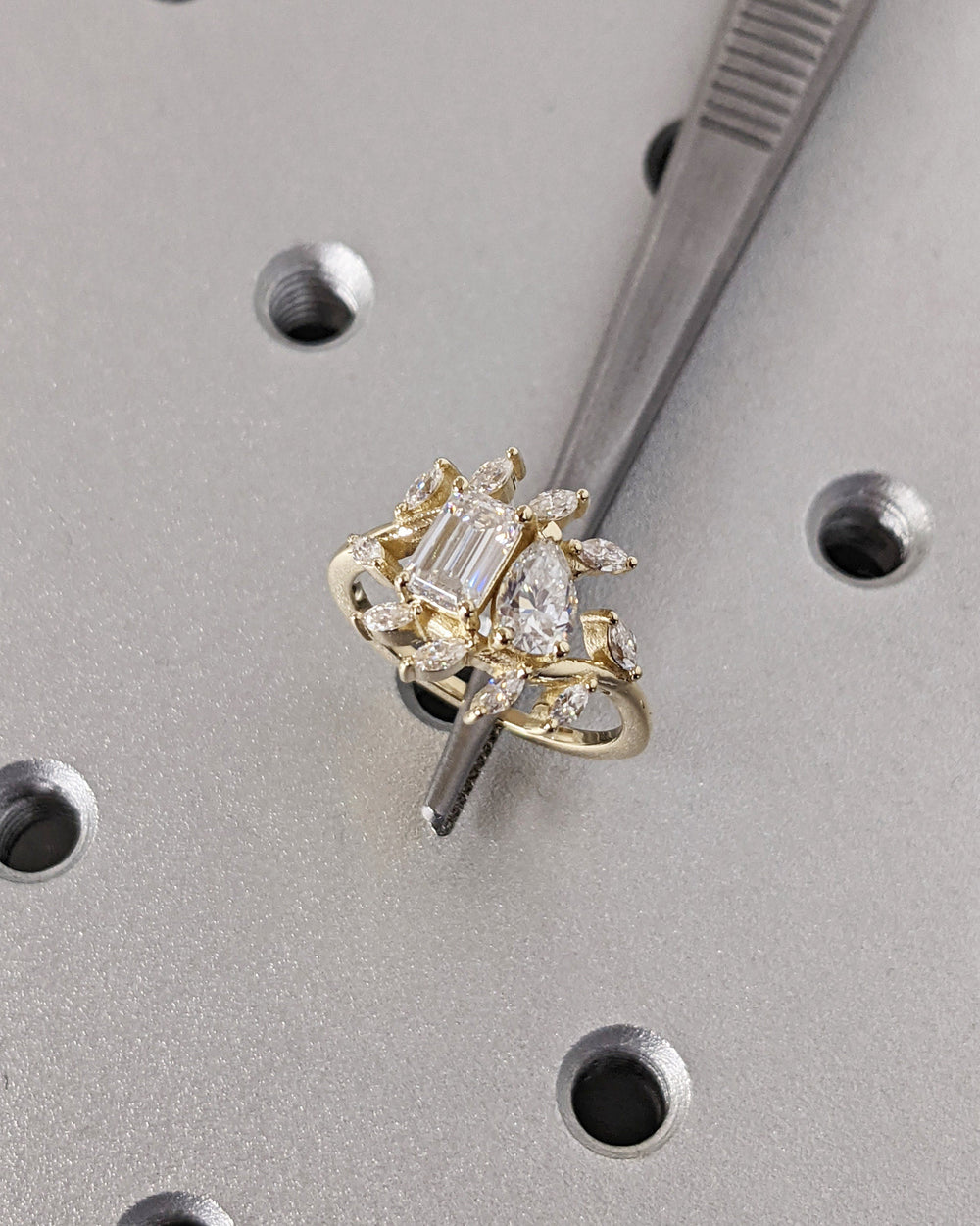 ✥ Introducing the enchanting 0.50CT Emerald & Pear Cut Toi et Moi Lab Grown Diamond Cluster Engagement Ring for her, a timeless piece that beautifully symbolizes the union of two souls. This stunning ring features a captivating emerald cut diamond alongside a graceful pear cut diamond, representing the unique bond and shared journey of love. The cluster of lab-grown diamonds adds a radiant touch, enhancing the overall brilliance and elegance of the design. Perfect for engagements or special occasions, this ring is a cherished keepsake. We have options of 1.0ct & 1.50ct available, and if you need any carat sizes, please contact us for personalized assistance. Celebrate your love story with this exquisite piece that embodies romance and sophistication.