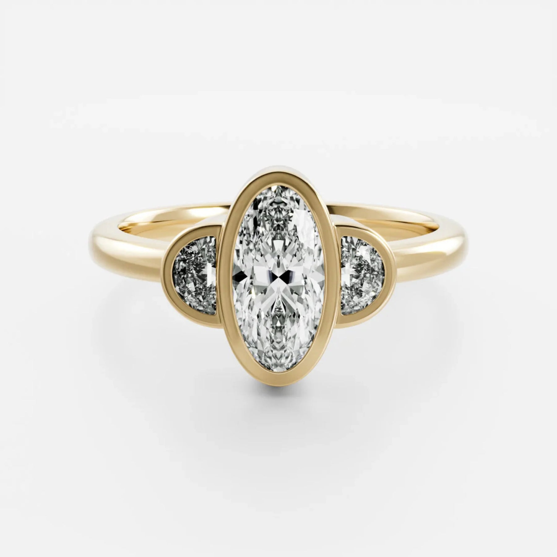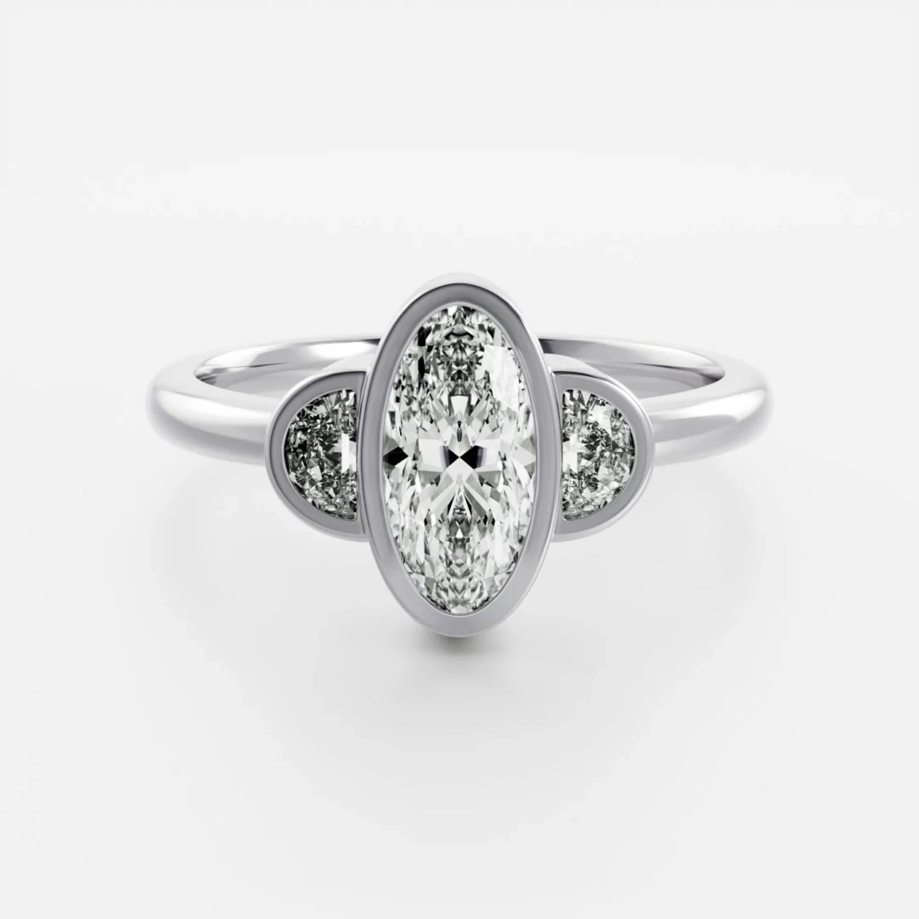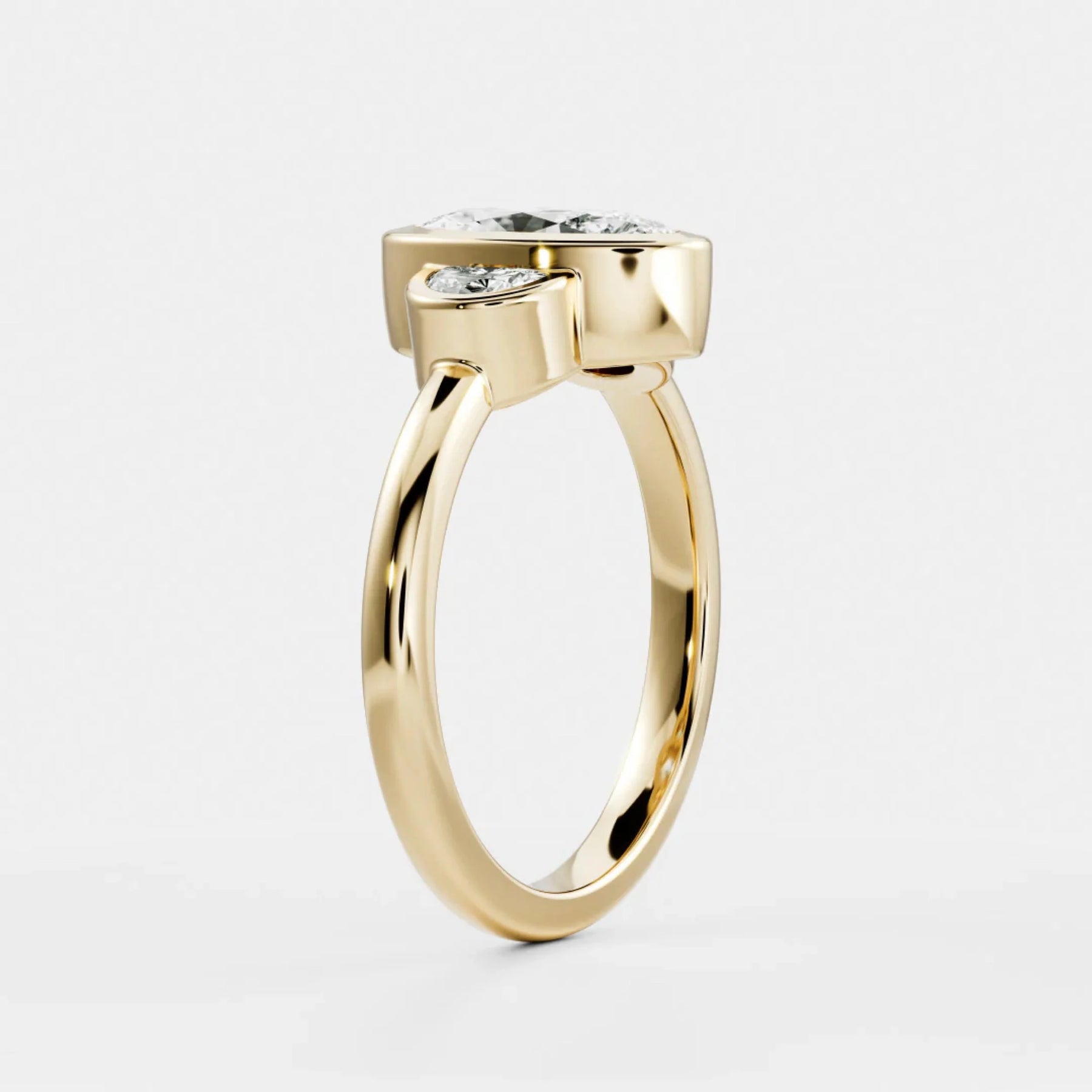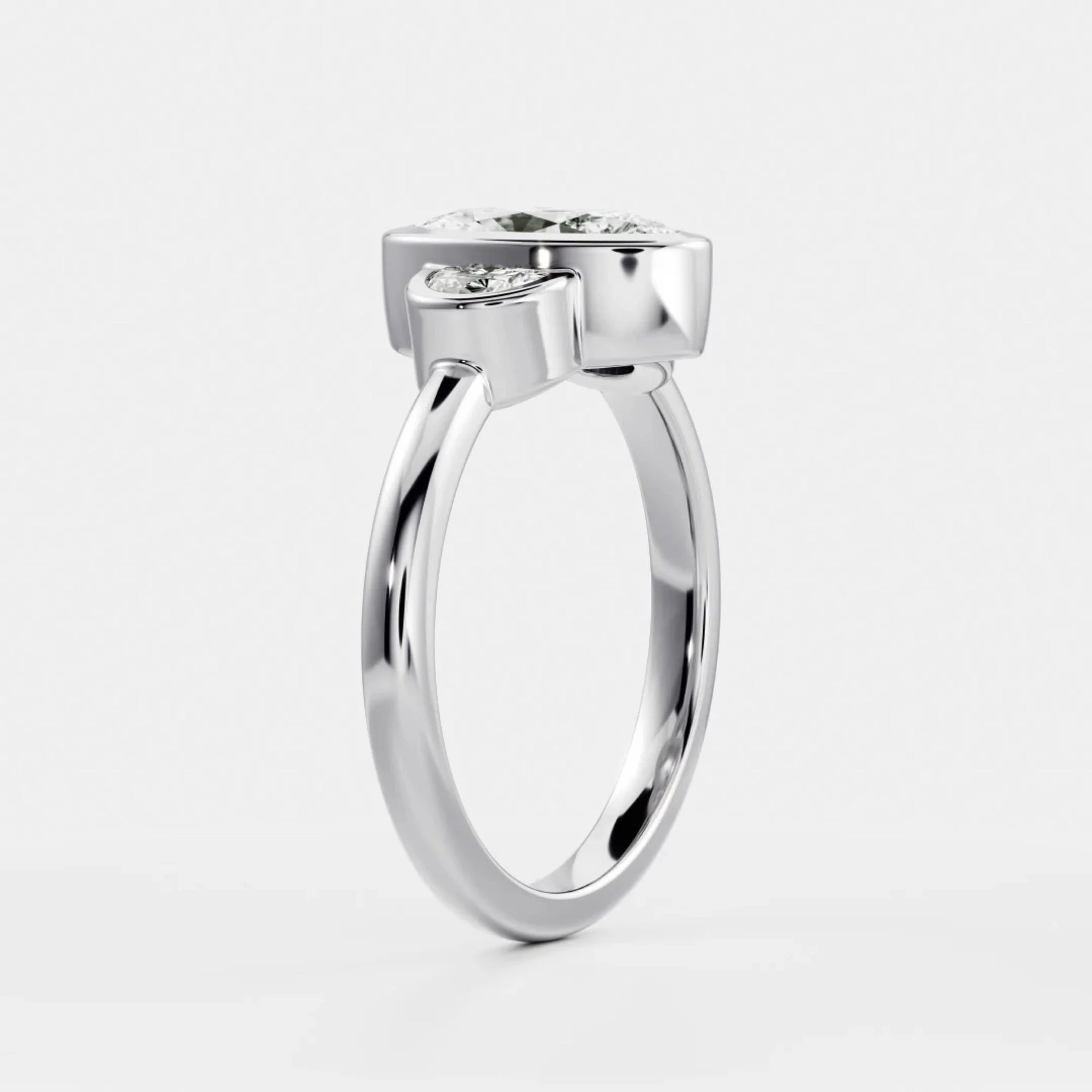 This 2.0CT Bezel Set Oval Cut Lab Grown Diamond Three Stone Engagement Ring combines sleek contemporary design with heartfelt symbolism. The oval center stone is securely wrapped in a smooth bezel setting, giving it a clean, modern edge while enhancing its natural brilliance. Flanked by two sparkling side diamonds, the three-stone arrangement represents your past, present, and future in a meaningful, elegant way. Ethically crafted with a refined silhouette, this ring is perfect for those who love modern simplicity paired with timeless romance.