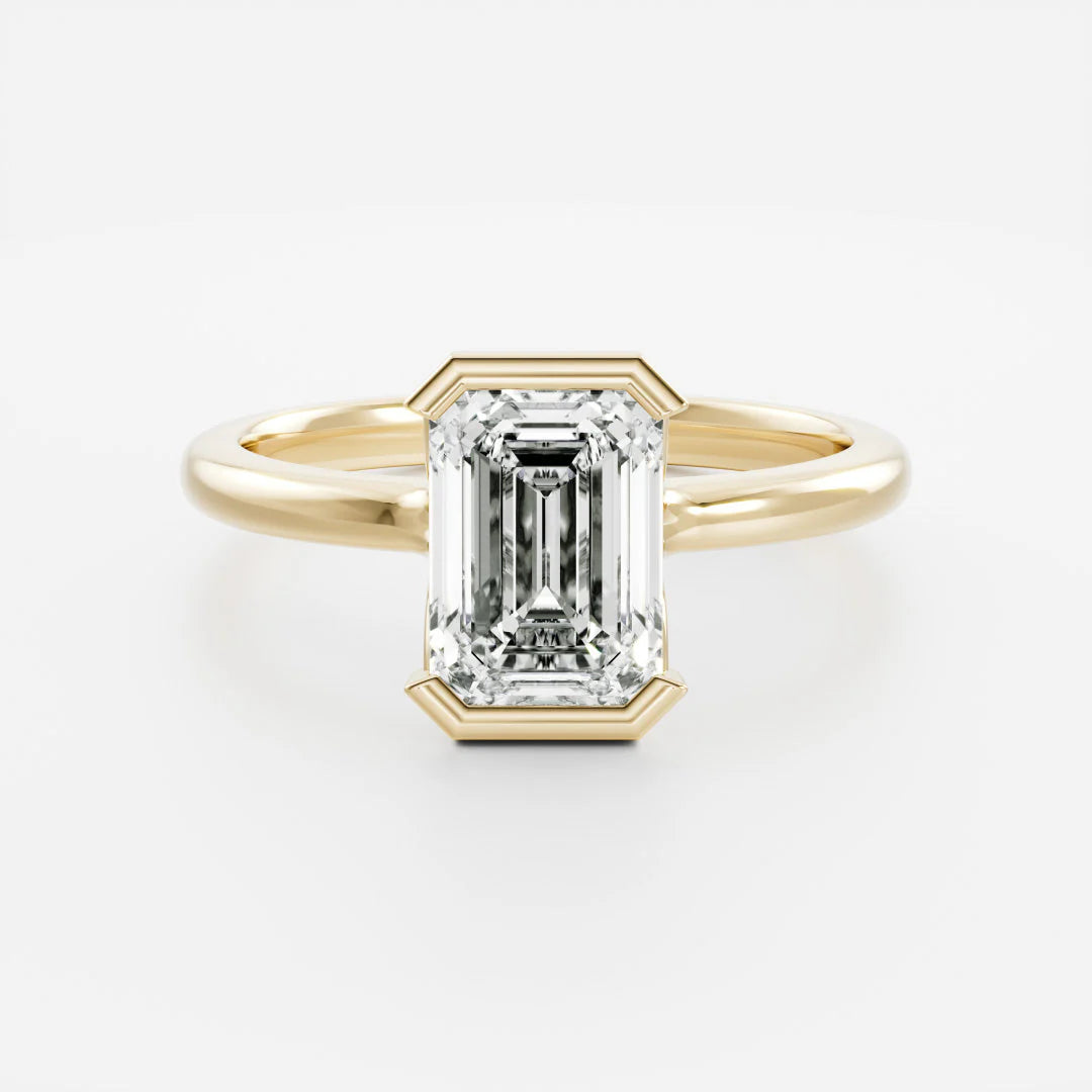 This 2.0 CT Half Bezel Set Emerald Cut Lab Grown Diamond Solitaire Engagement Ring exudes timeless elegance and refined sophistication. The striking emerald-cut lab-grown diamond center is partially secured in a sleek half-bezel setting, highlighting its clarity and brilliance. Crafted on a polished gold band, the solitaire design combines classic charm with lasting beauty. Perfect for those seeking a trending and distinctive engagement ring with ethical and sustainable luxury. A stunning choice to celebrate enduring love.
