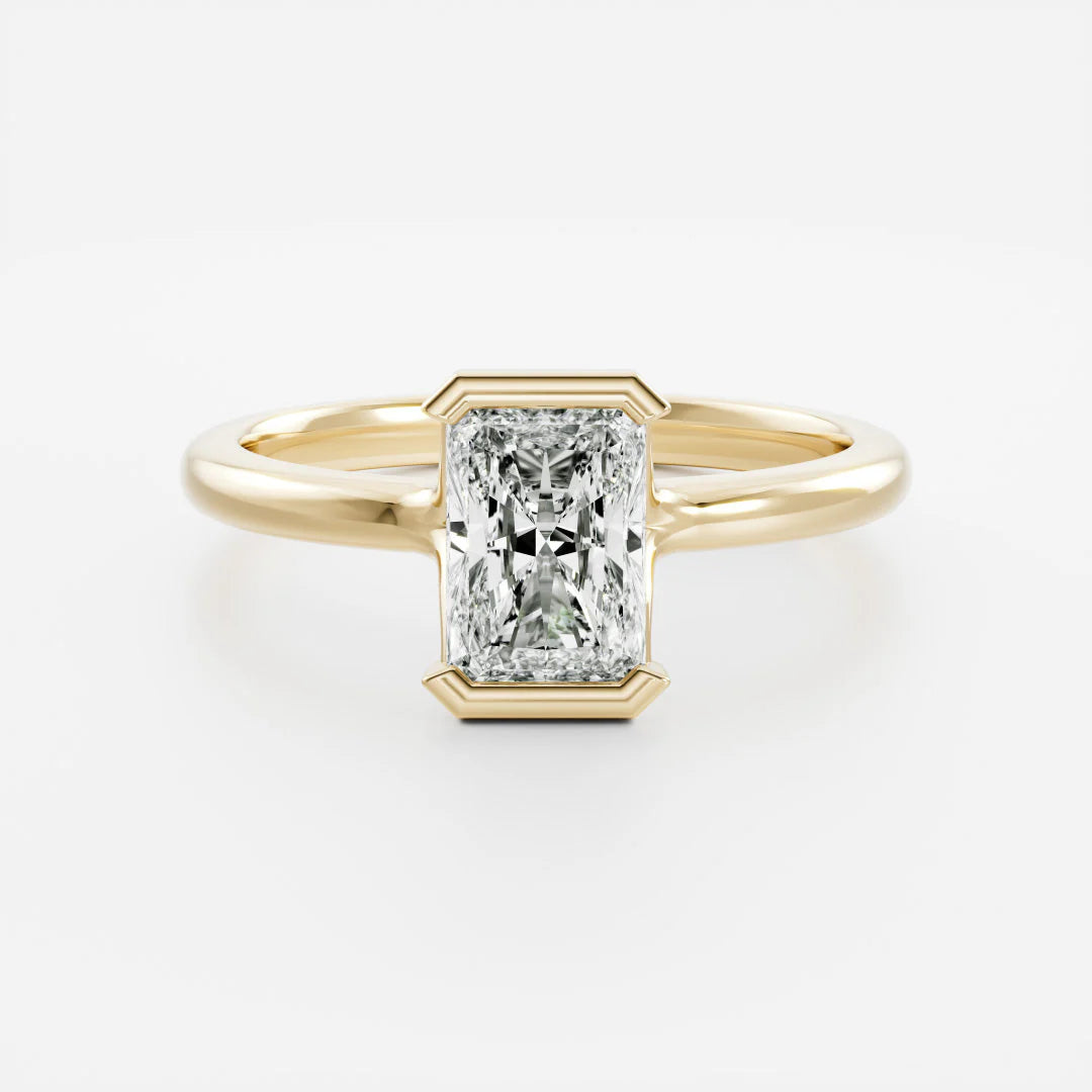 This 2.0 CT Half Bezel Set Radiant Cut Lab Grown Diamond Solitaire Engagement Ring exudes modern elegance and timeless sophistication. The dazzling radiant-cut lab-grown diamond center is partially secured in a sleek half-bezel setting, enhancing its brilliance and sparkle. Crafted on a polished gold band, the solitaire design combines contemporary style with enduring beauty. Perfect for those seeking a trending and distinctive engagement ring with ethical and sustainable luxury. A stunning choice to celebrate enduring love.