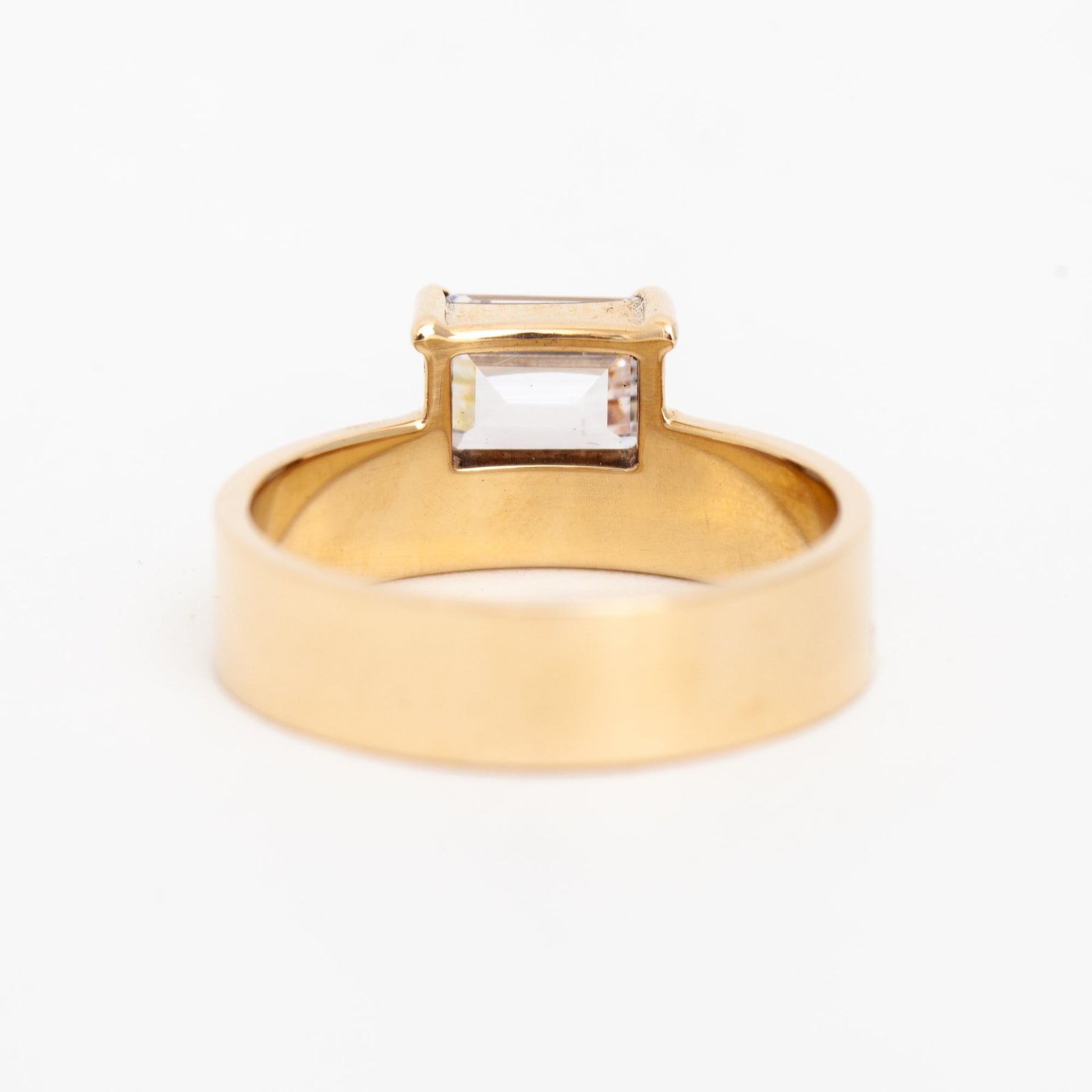 This 1.0 CT East West Emerald Cut E/VS1 Lab Grown Diamond Monolith Engagement Ring exudes modern elegance and architectural sophistication. The striking emerald-cut lab-grown diamond is set in a unique east-west orientation within a bold monolith-style design, creating a contemporary and eye-catching look. Crafted on a polished gold band, the ring combines sleek style with lasting brilliance. Perfect for those seeking a trending and distinctive engagement ring with ethical and sustainable luxury. A stunning choice to celebrate enduring love.