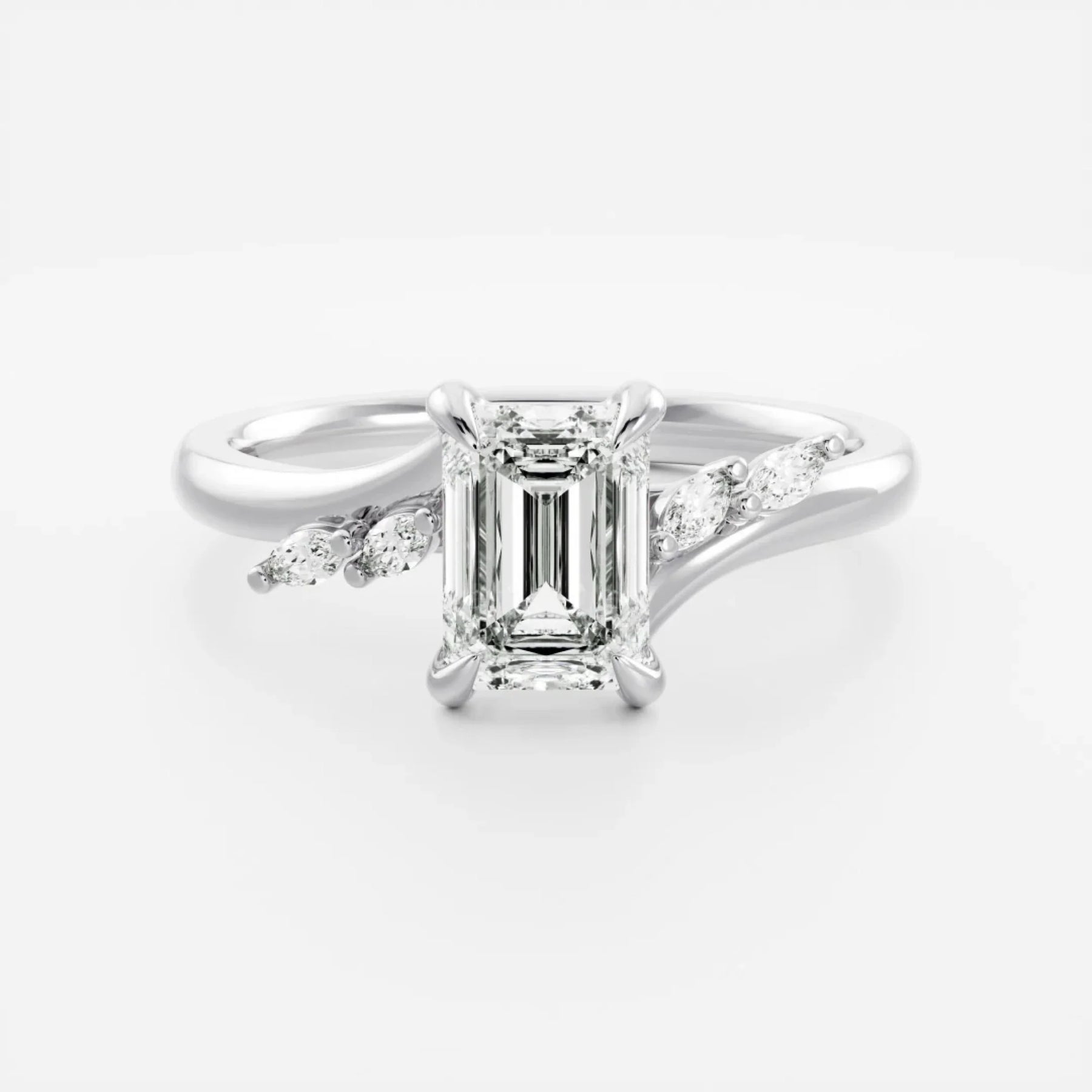 This 2.0 CT Emerald Cut Lab Grown Diamond Twisted Band Engagement Ring exudes modern elegance and sophisticated charm. The striking emerald-cut lab-grown diamond center is beautifully complemented by a gracefully twisted band, adding movement and visual interest. Crafted on a polished gold band, the ring combines contemporary style with lasting brilliance. Perfect for those seeking a trending and distinctive engagement ring with ethical and sustainable luxury. A stunning choice to celebrate enduring love.