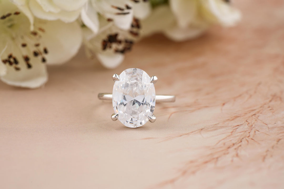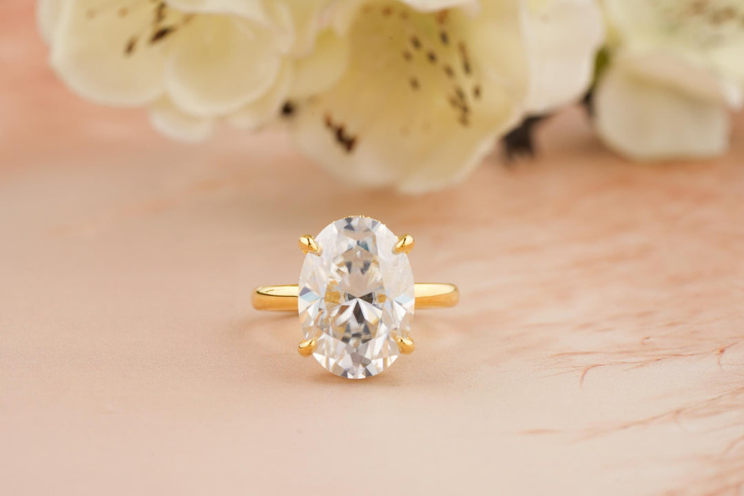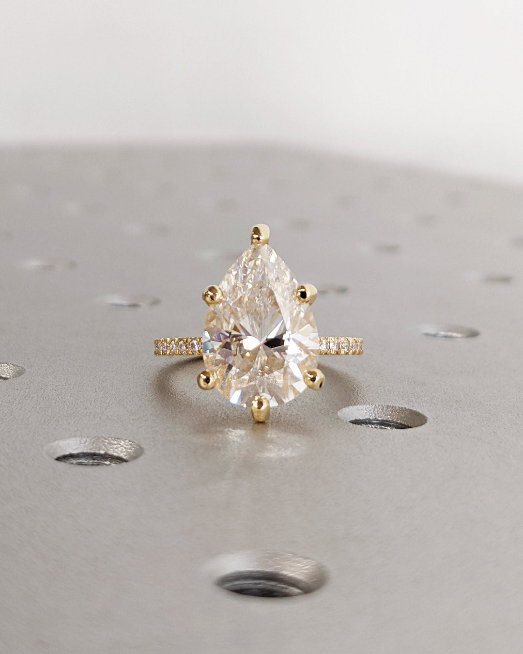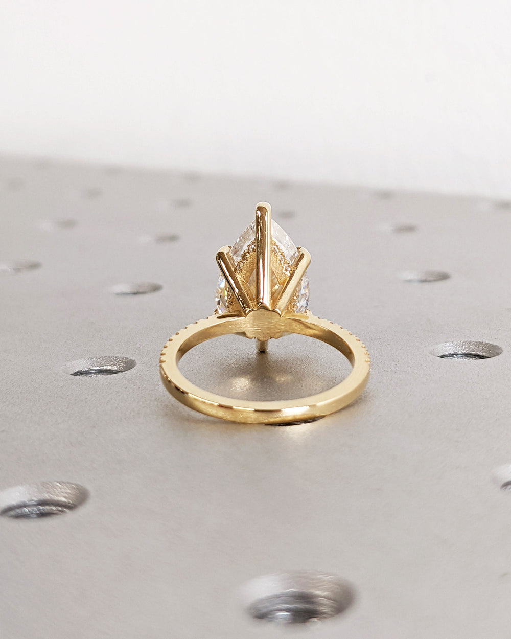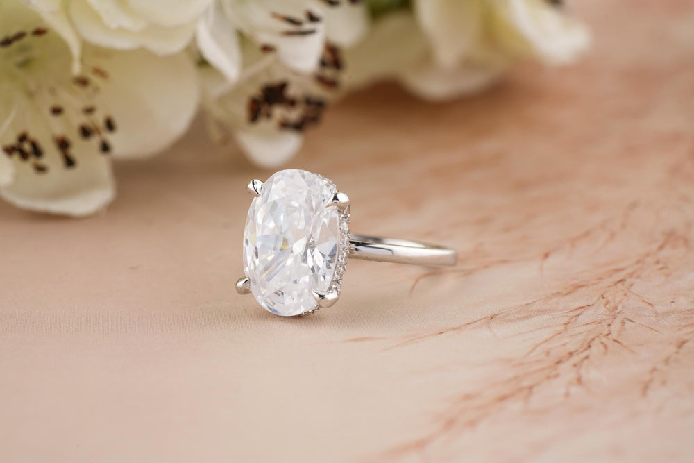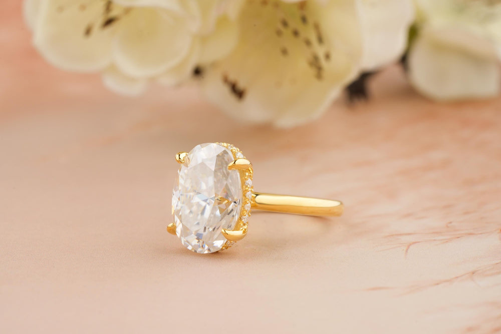 "A subtle halo of diamonds beneath the center stone, adding hidden sparkle for an elegant and modern touch."