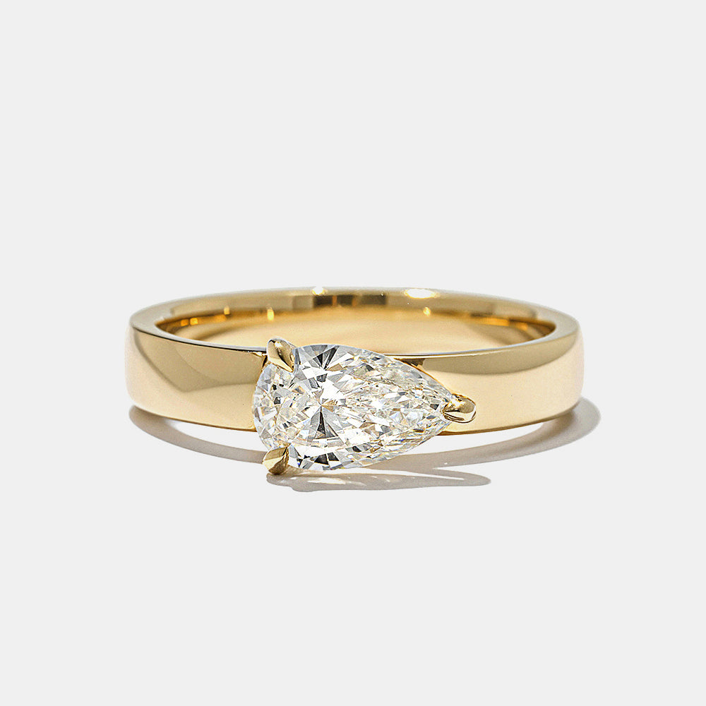 The 0.75CT East West Pear Cut E/VS1 Lab Grown Diamond Solitaire Engagement Ring beautifully blends modern design with romantic charm. Featuring a horizontally set pear-shaped diamond, it stands out among unique engagement rings for its graceful and distinctive look. Ideal as a symbolic wedding ring, it represents love, elegance, and individuality. Meticulously crafted to sparkle with brilliance, it shines among diamond engagement rings for its refined simplicity. A perfect timeless engagement ring for those who seek unique diamond rings that radiate sophistication and style.