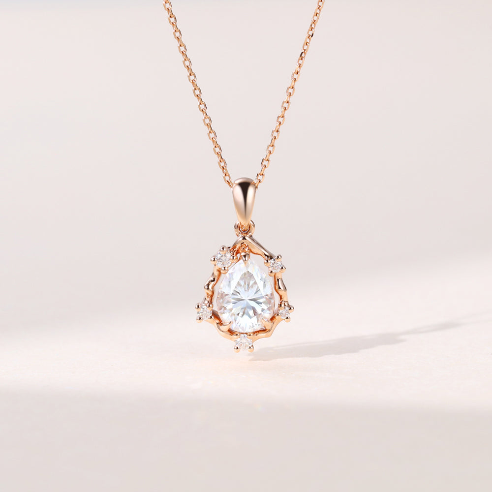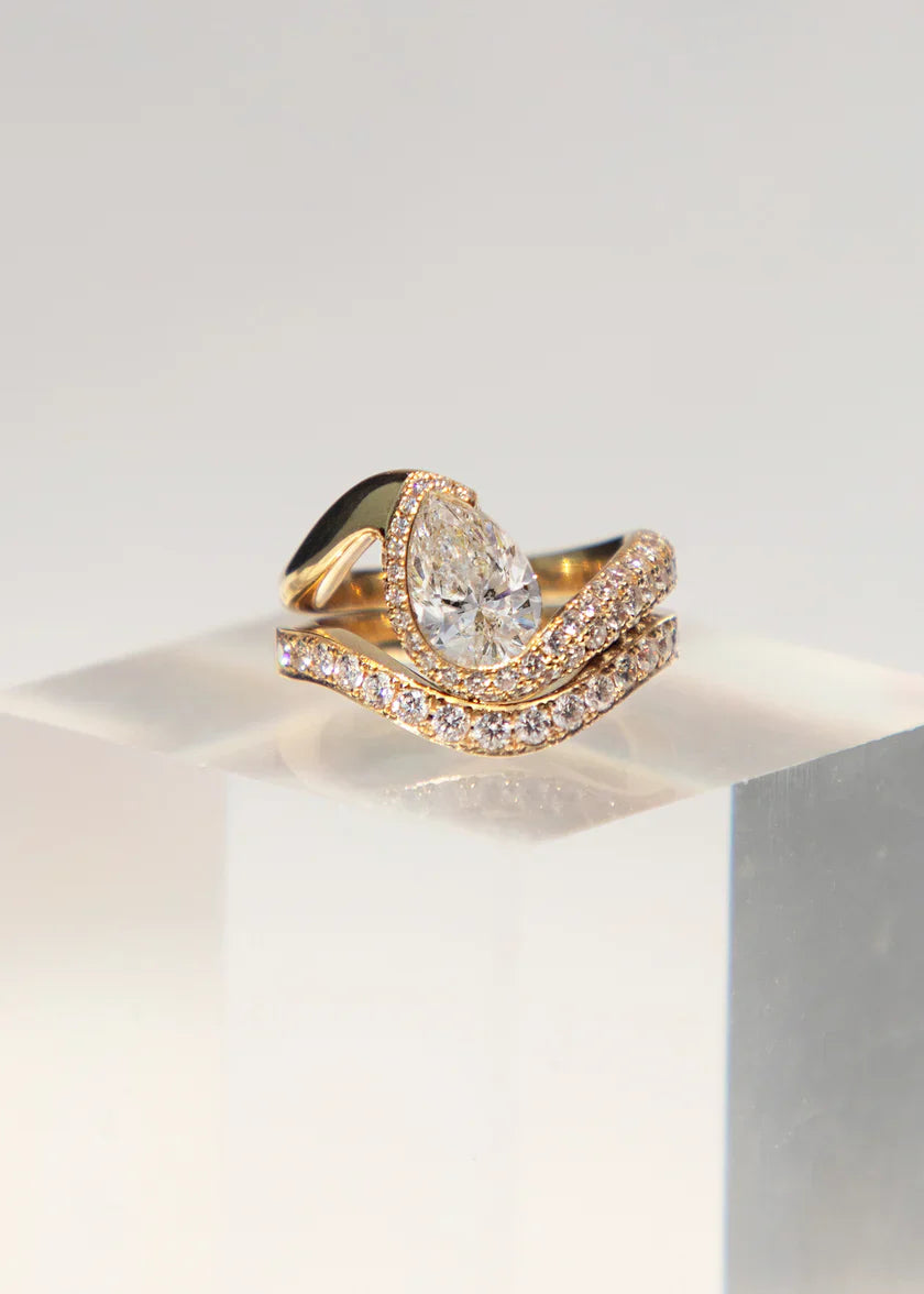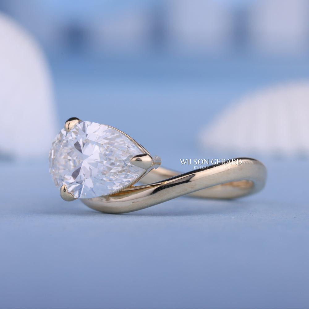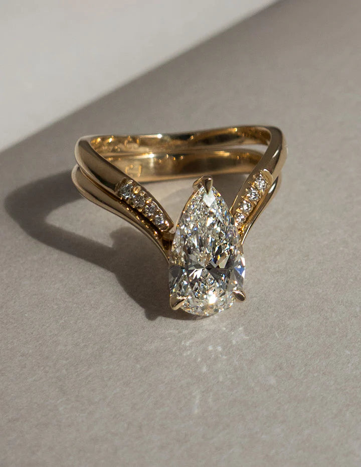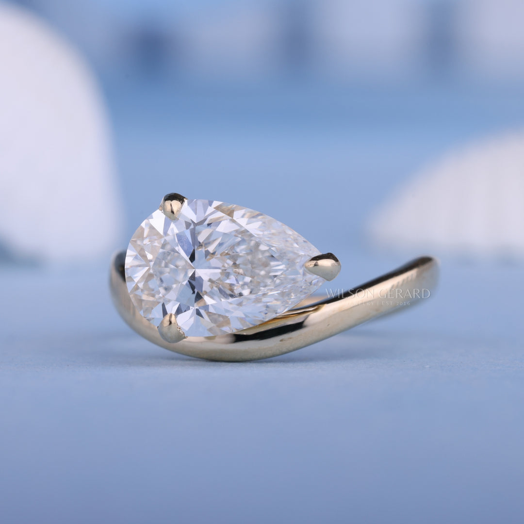"A pear diamond ring combines a round cut's brilliance with a marquise's sophistication, creating a unique teardrop shape. Symbolizing love and individuality, this design elongates the finger and maximizes sparkle. Perfect for those who seek elegance with a modern touch. πŸ’βœ¨"